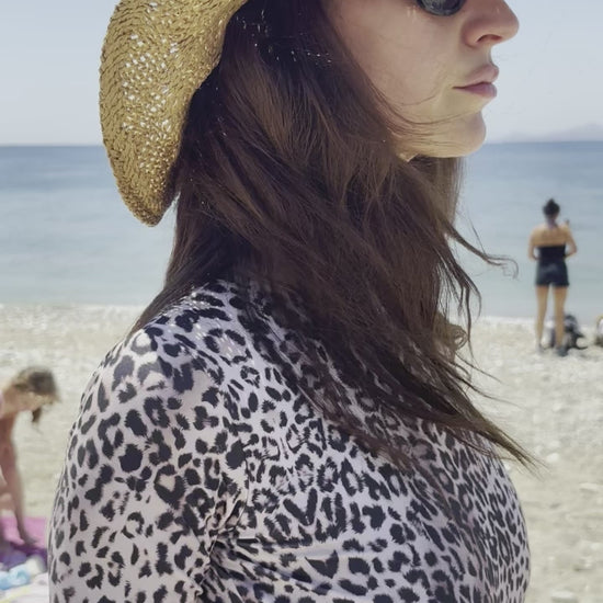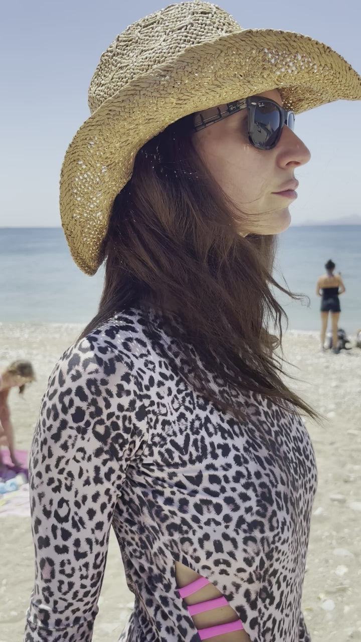 Γυναικείο μαγιό λεοπάρ με κόψιμο μπροστά με φλούο λεπτομέρειες και ανοιχτή πλάτη με κούμπωμα στο λαιμό.